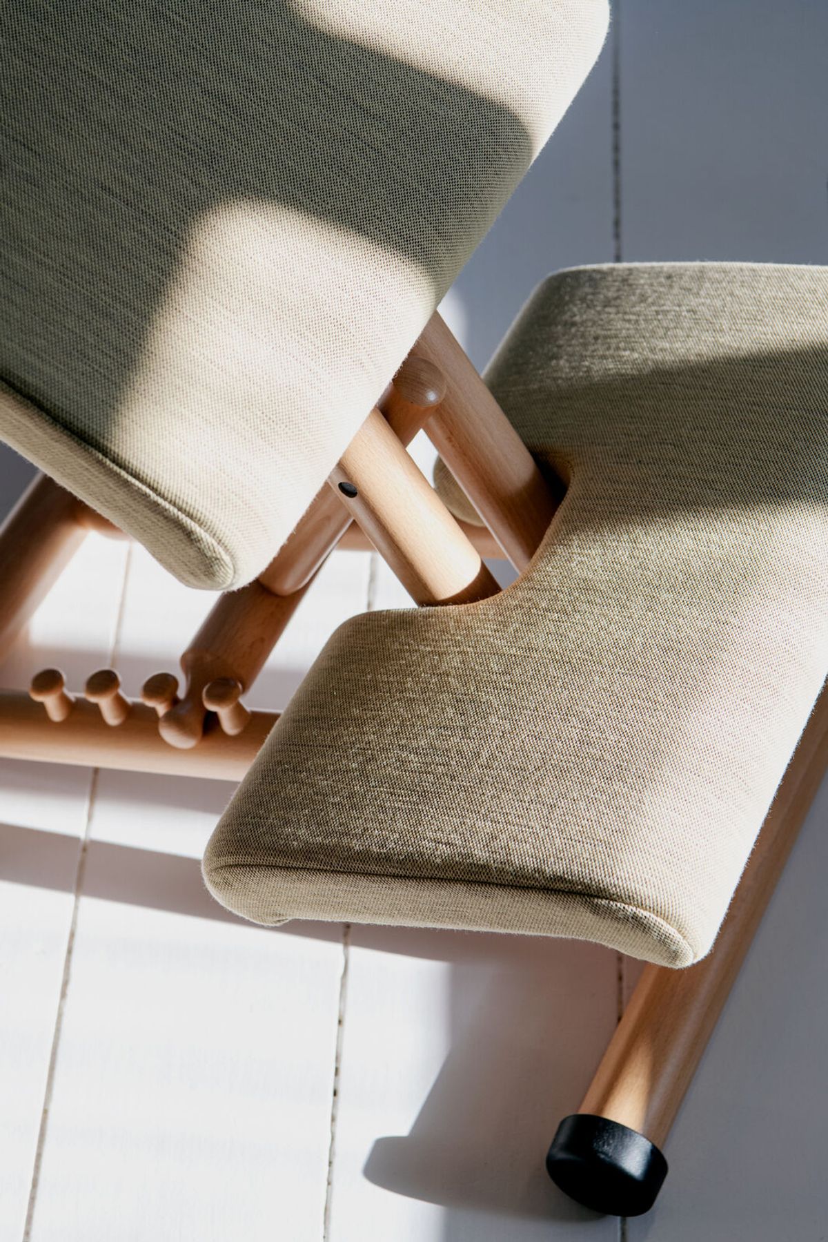Thanks to its wood knobs, the seat can be positioned at four different angles. When in the very highest position, Multi™ allows for a steep sitting posture which is almost as easy on the back as standing. Pull towards or push away from the tabletop when sitting down or getting up and Multi™ will follow.