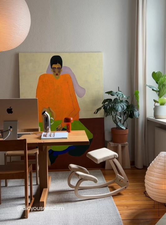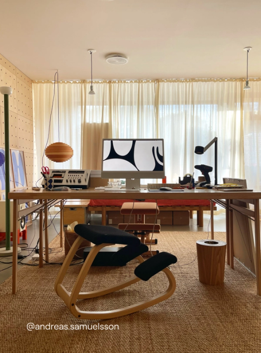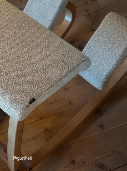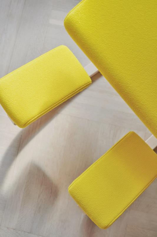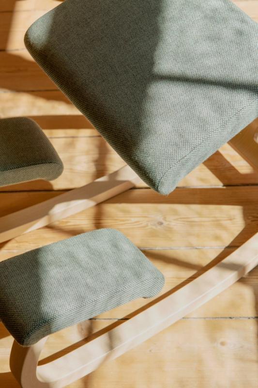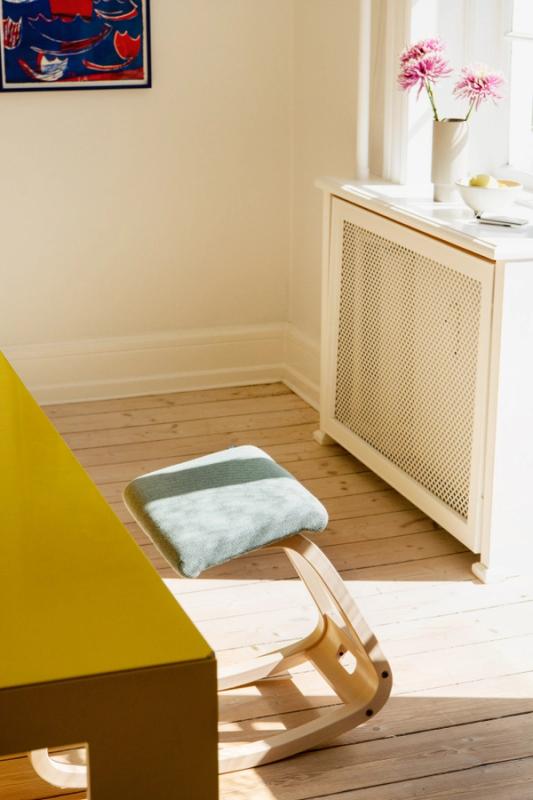 The curved runners of the kneeling chair allow for gentle rocking motions, while the tilted seat enables an open hip angle. This allows the spine to adopt the natural curve it has when we stand upright, also while seated. The two cushions beneath the seat can be used to rest your shins, one foot, both or neither, by placing both feet on the ground. With its minimalist design, the chair invites the whole body to move and every shift of weight will provide movement to a new angle.